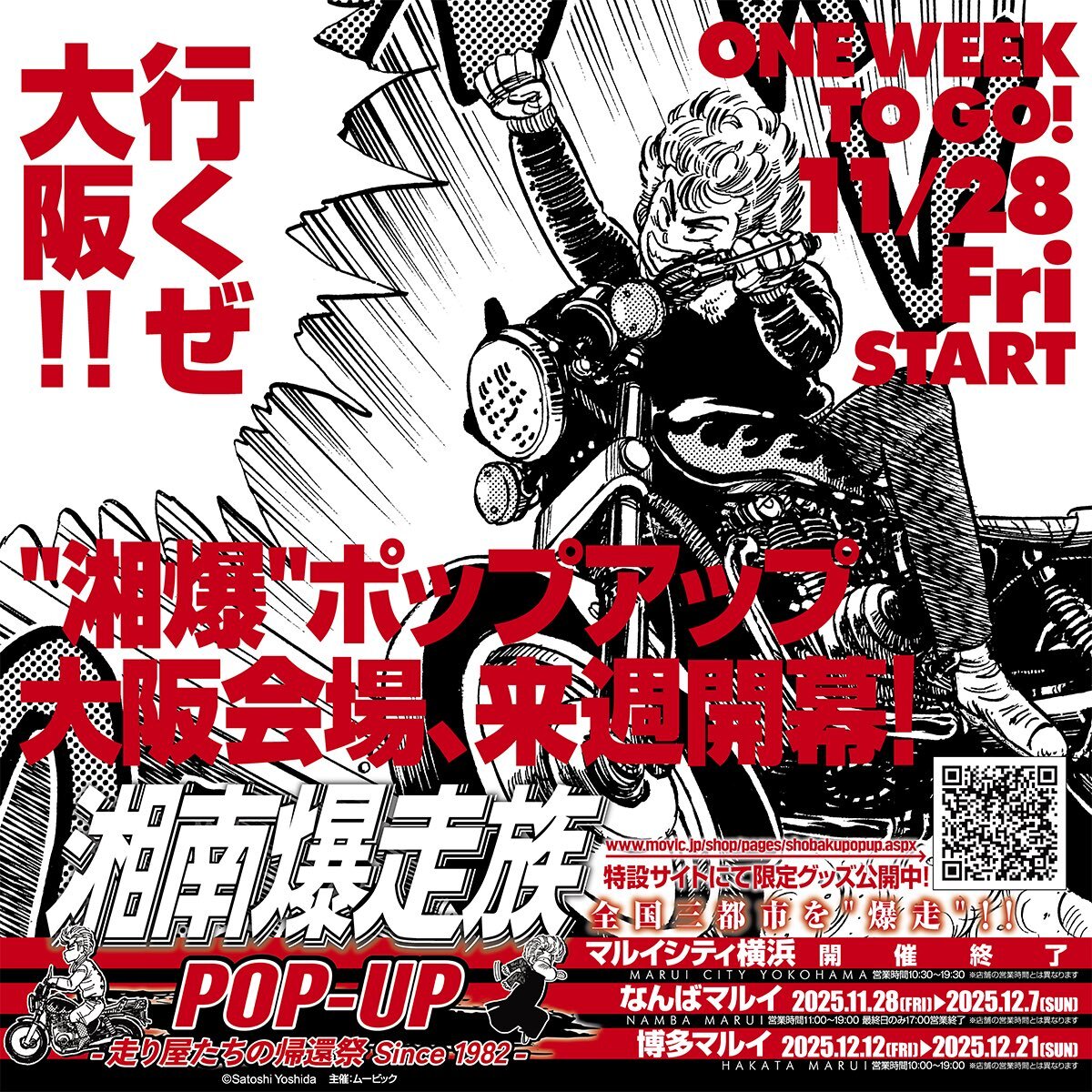 ━━━━━━━━━━━━━━━━ #湘南爆走族 POP-UP -走り屋たちの帰還祭 Since 1982- ━━━━━━━━━━━━━━━━ 📢いよいよ来週‼︎✨ 大阪会場まもなく開催🎉 【会場】なんばマルイ 【期間】11月28日〜12月7日 ★詳細はこちらからチェック★ movic.jp/shop/pages/sho… #湘爆 pic.x.com/p7Sj8GPh8Y
