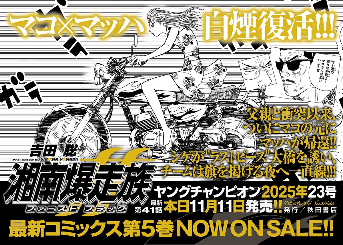 初代を描く𠮷田聡『湘南爆走族ファーストフラッグ』最新第41話、本日11/11発売ヤングチャンピオン23号に掲載!チームへと誘うシゲに大橋の返事は…?そして山田と砂知子の間に生じた恋仲の亀裂は果たして!? #湘南爆走族ファーストフラッグ #湘南爆走族 #湘爆 #吉田聡 #ヤングチャンピオン #秋田書店 pic.x.com/2k9mfYBe9S