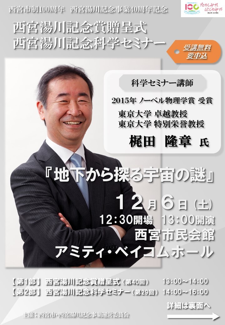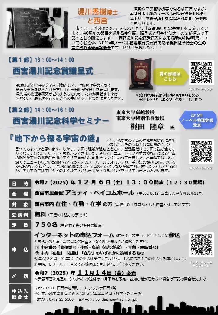 ▼▽西宮湯川記念科学セミナー▽▼ 12/6(土)13:00~16:00に アミティ・ベイコムホールで開催。 今年は2015年ノーベル物理学賞受賞者の 梶田隆章博士を講師にお招きします👏 申込は11/14(金)まで。 詳細は市HPで確認を。 ぜひ、ご参加ください!✨ nishi.or.jp/bunka/shogaiga… #湯川秀樹 #ノーベル賞 pic.x.com/SIeCsQo33S
