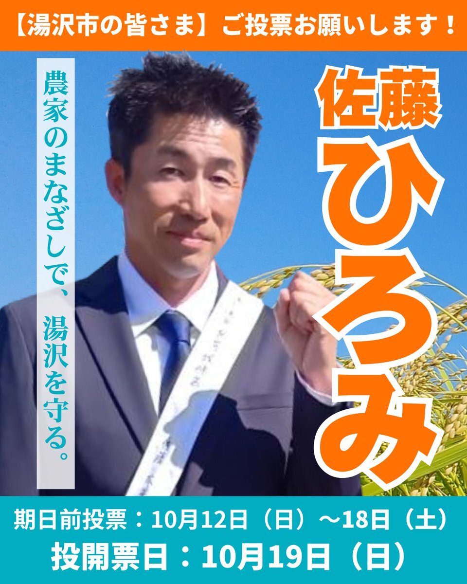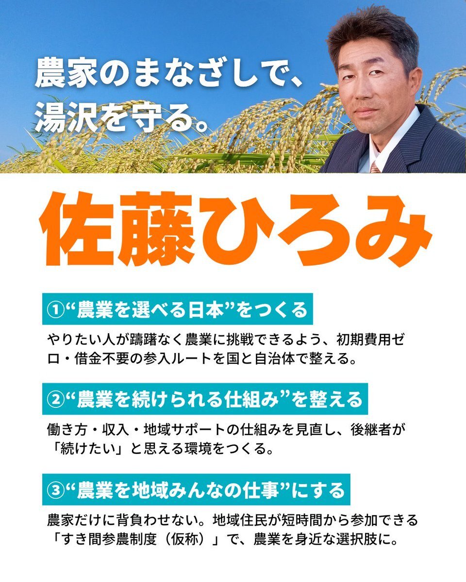 佐藤ひろみ候補は、現役の農家。酒米を作っています。農家のあまりの高齢化に危機感をいだいてます。今こそ、生産者と消費者が、共に手を取りあいましょう。 「農家のまなざしで湯沢を守る」 佐藤ひろみをよろしくお願いします。 #佐藤ひろみ #湯沢市議会議員選挙 pic.x.com/gR026uSj5t