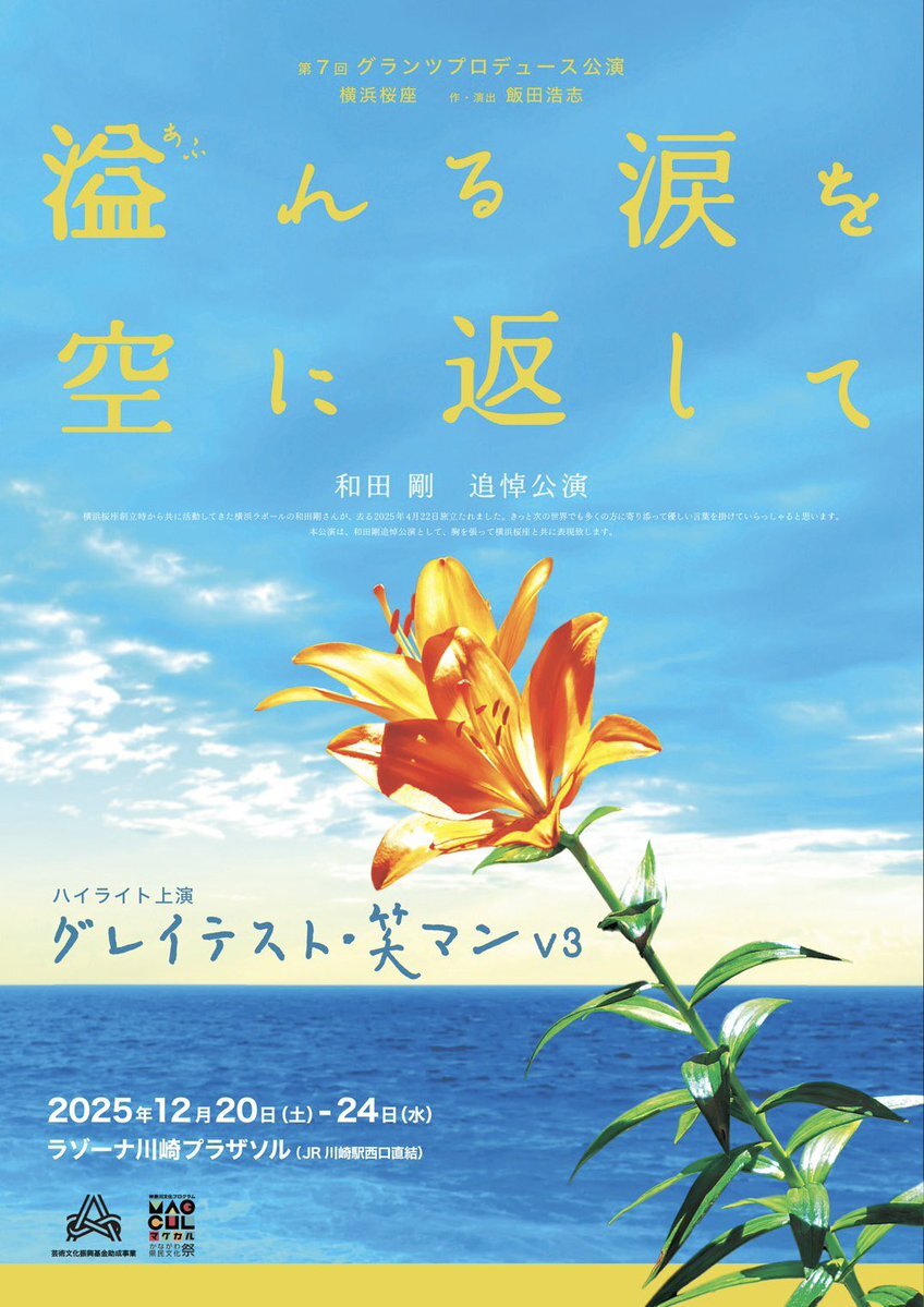 グランツプロデュース&横浜桜座 2本立て公演 『#溢れる涙を空に返して』 『#グレイテスト・笑マンV3』(#横浜桜座) ◇公演スケジュール◇ 12月 20日(土)13:00/18:00 21日(日)13:00 22日(月)14:00 23日(火)14:00 24日(水)14:00 ◆ラゾーナ川崎プラザソル