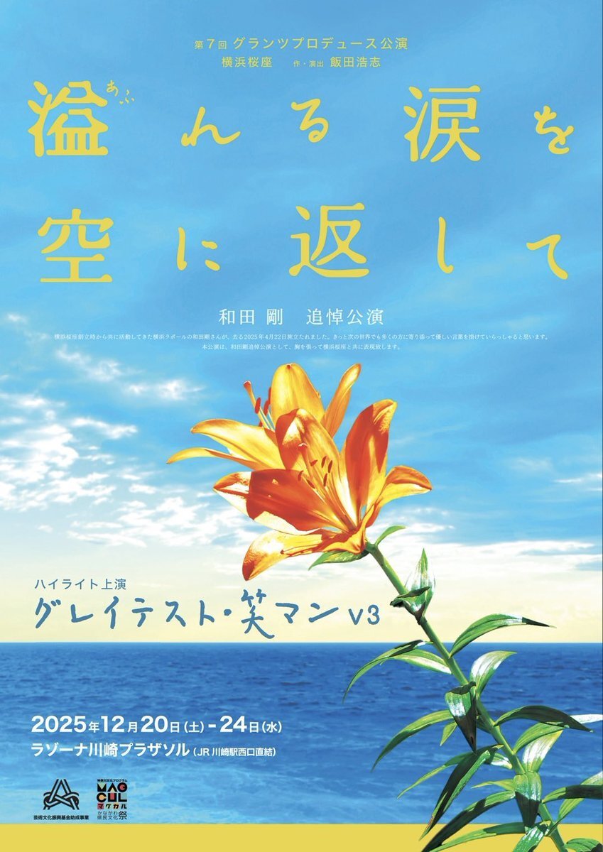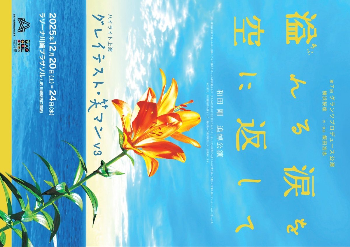 グランツプロデュース&横浜桜座 2本立て公演 『#溢れる涙を空に返して』 『#グレイテスト・笑マンV3』(#横浜桜座) 📅公演スケジュール📅 12月 20日(土)13:00/18:00 21日(日)13:00 22日(月)14:00 23日(火)14:00 24日(水)14:00 📍ラゾーナ川崎プラザソル 🎫チケット申込み▶️stage.corich.jp/stage/394516/t… pic.x.com/4rvdBcEZAv
