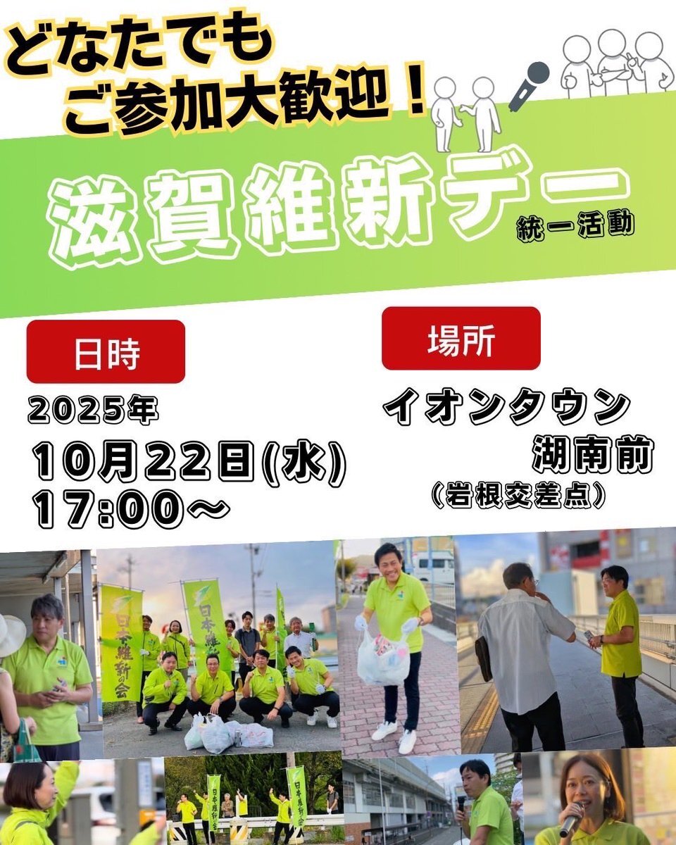 滋賀維新の会統一活動デー👍 湖南市イオンタウンにて、選挙期間に引き続きお騒がせし、熱い思いをお伝えさせていただきました🎤🔥 今後とも日本維新の会、滋賀維新の会をよろしくお願いいたします🙇 #湖南市 #湖南市議会議員 #日本維新の会 #滋賀維新の会 #ひがしら一成 #滋賀維新の会統一活動デー pic.x.com/c4DdRHXNXe