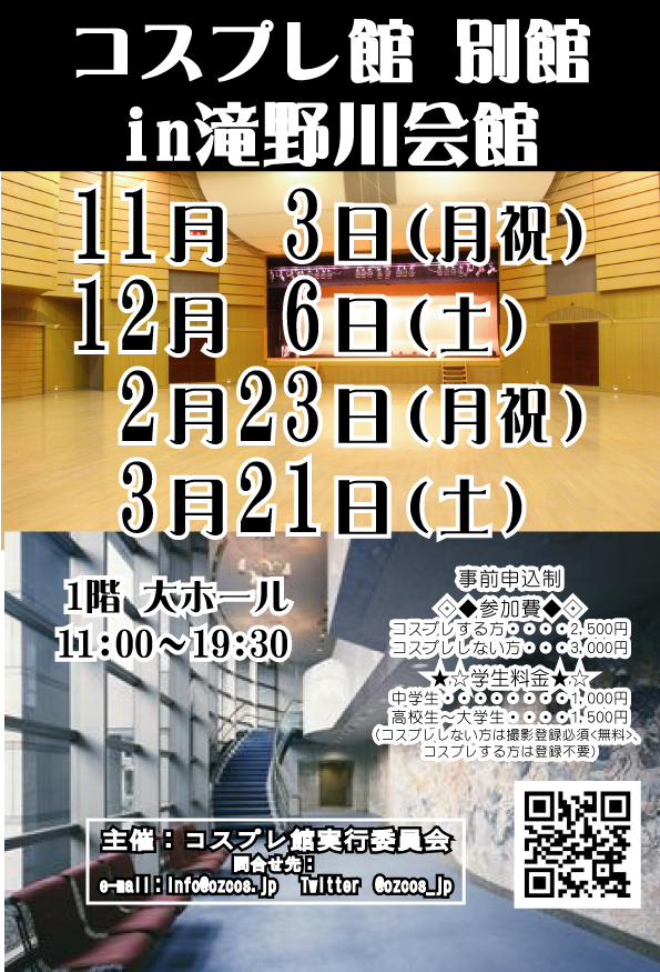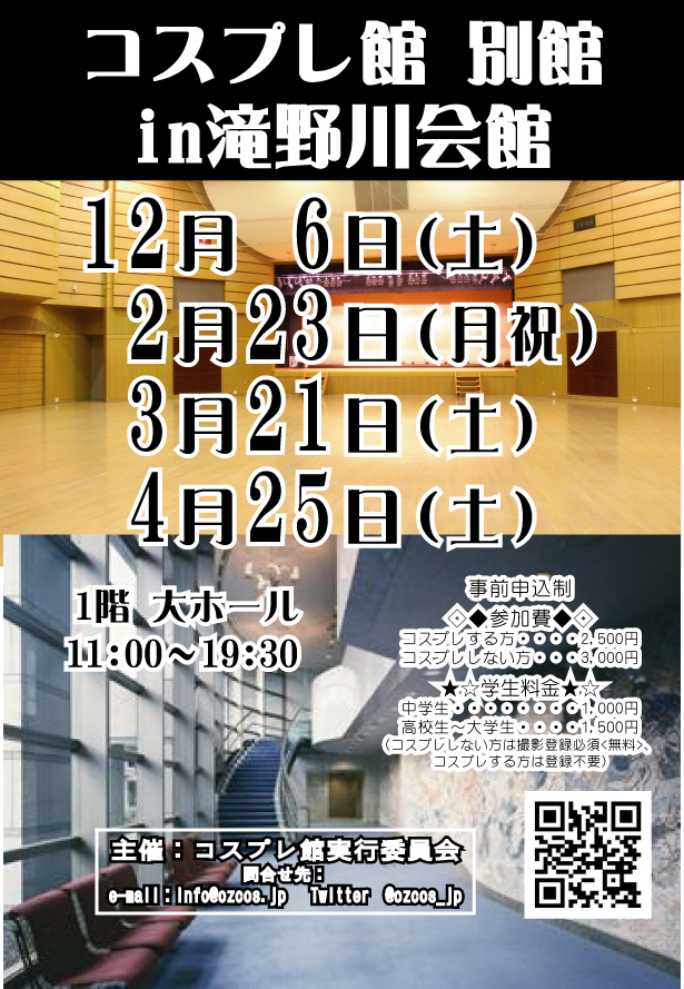 【コスプレ館からのお知らせ】 2025.12.6(土) 開催 コスプレ館 別館in滝野川会館 1階大ホール 11:00~19:30 ただいまより事前申込を開始いたします forms.gle/erudYzBQXKXX8D… ※通常開催 #コスプレ #ダンパ #滝野川会館 #コスプレ館 pic.x.com/8MjMsjUm4X
