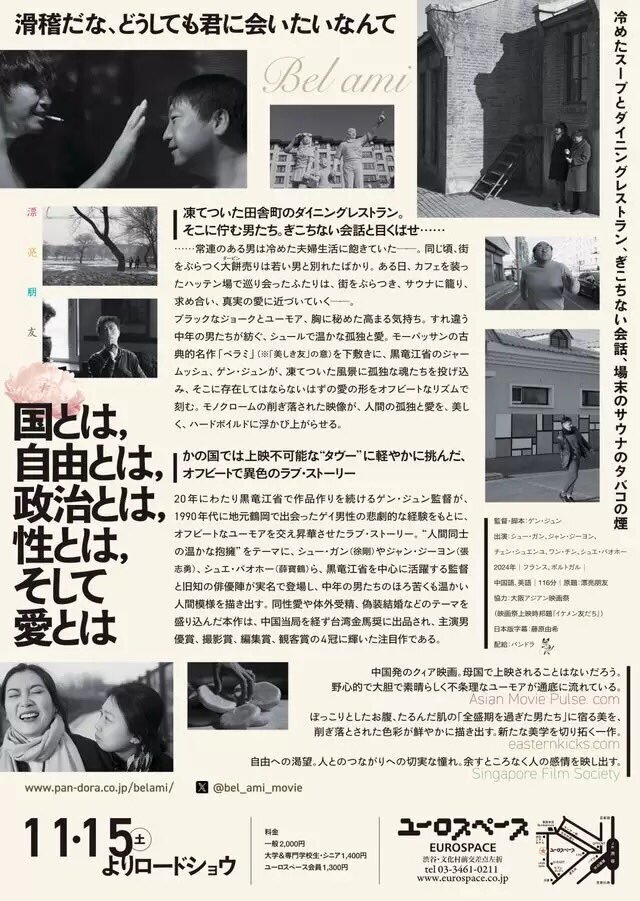 ◢◤ いよいよ明日公開!◢◤ 『#ベ・ラ・ミ 気になるあなた』 同性の友、求む この国に同志はいない🚬恋人は、いる 黒竜江省のジャームッシュ、ゲン・ジュンが贈る かの国では上映不可能な“タブー”に軽やかに挑んだオフビートで異色のラブ・ストーリー 𝟏𝟏.𝟏𝟓@euro_space 🌈#漂亮朋友 #BelAmi pic.x.com/5uOpBlPU5k