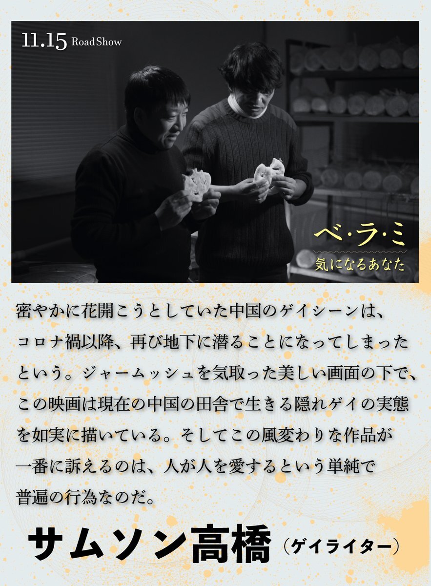 ━━━━ 𝐂𝐎𝐌𝐌𝐄𝐍𝐓 ━━━━ #サムソン高橋 さん(ゲイライター)🖋️ @samsontakahashi ❝ この風変わりな作品が一番に訴えるのは、 人が人を愛するという単純で普遍の行為なのだ ❞ ━━━━ #ベ・ラ・ミ #ベラミ #BelAmi 𝟏𝟏.𝟏𝟓 𝐑𝐨𝐚𝐝 𝐒𝐡𝐨𝐰🎬🌈 #中国発のクィア映画 #漂亮朋友 pic.x.com/ilSJZAUGaf