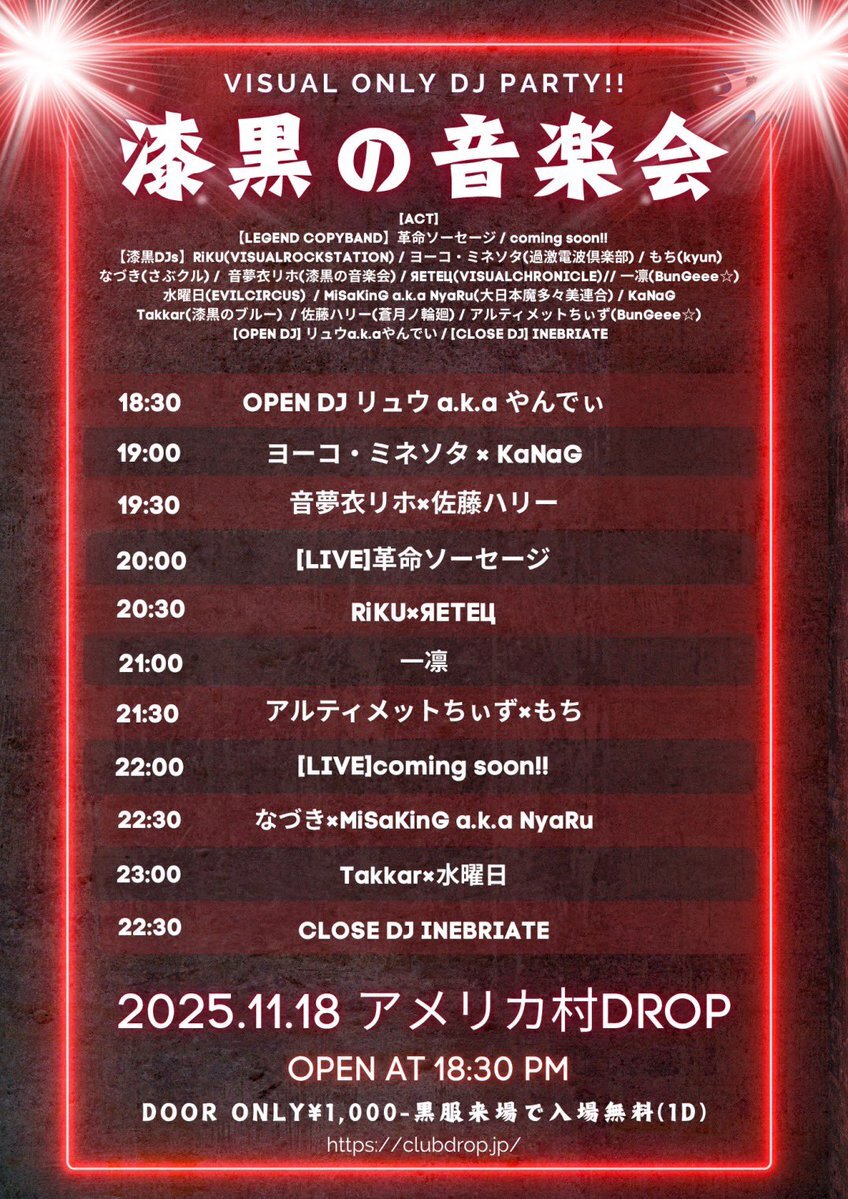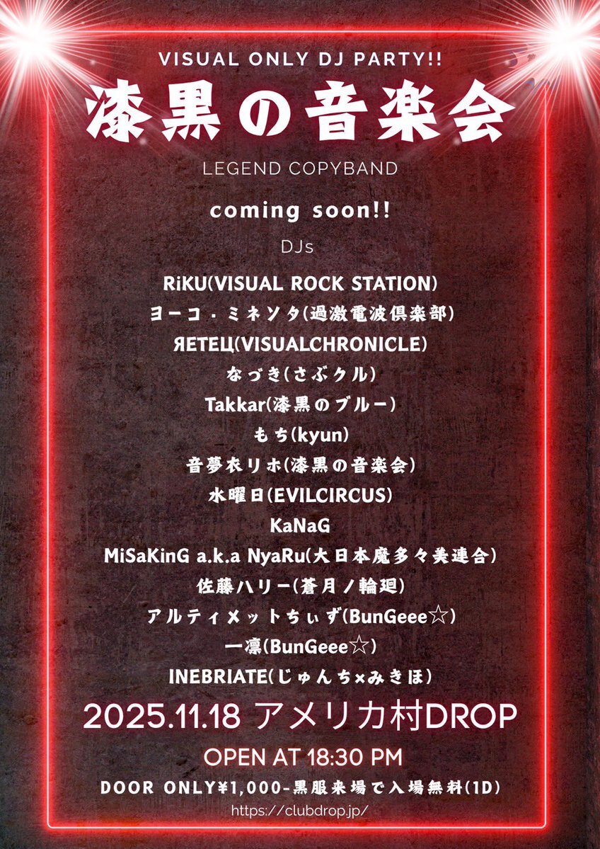 【来月!!】 #漆黒の音楽会 11/18(火)18:30〜 📍アメリカ村DROP 黒服着用で入場無料! 毎回最狂に盛り上がる平日のヴィジュアル系DJイベント「漆黒の音楽会」が来月開催です!! 今回もDJのB2Bとレジェンドコピーバンドのライブ有りです! 是非予定を空けておいてください!! pic.x.com/D2f5b0xMFZ