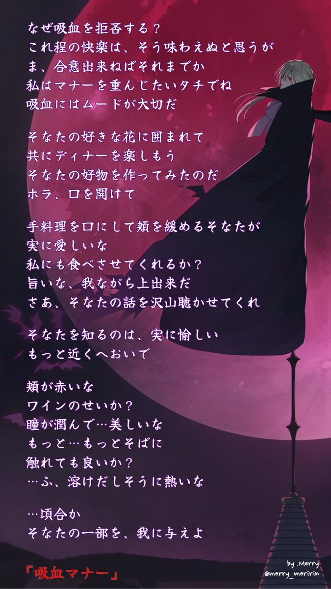 ミコ/茜椿♀︎さま(@m7jEeiQiUujthLe)のハロウィン企画に参加させていただきます(❁ᴗ͈ˬᴗ͈) 『吸血マナー』 その気にさせるのはマナーなんですよ? ……はーむっΣ(´□`(༥・` )カプッ #アナザーワールド予報 #アナザー書き物ワールド #フリー台本 #めりつむぎ x.com/m7jEeiQiUujthL…