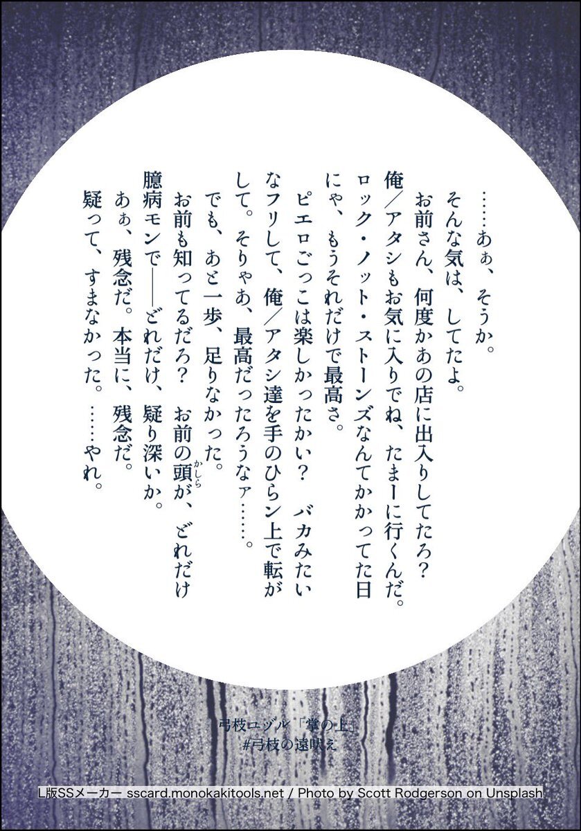 地獄とか 天国とかさ 結局人間の頭ン中で作り上げてるモンじゃん? 何かを 誰かを 信じて縋るのも自由だし 何百年 何千年 永い時間かけて築き上げたモンなんだろうし いや、そんなんもうどうでもいいんだけど …で、さ 『人間』の面して生きてきたお前は どっちに逝くと思ってる? …逝けると思うなよ