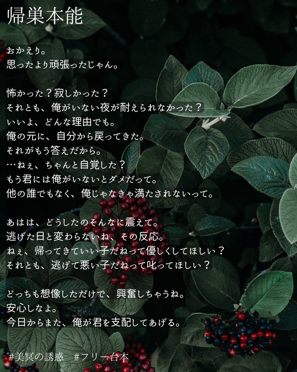《#美冥の誘惑 Ⅸ:帰巣本能》 認めたくないけど あなたがいないと足りないの *性別変更、アドリブ、アレンジはご自由に。 *使用報告は任意ですがあれば拝聴に参ります。 *フォロー、いいね、嬉しいです。 #フリー台本/#シチュボ台本/#シチュエーションボイス/#ドS