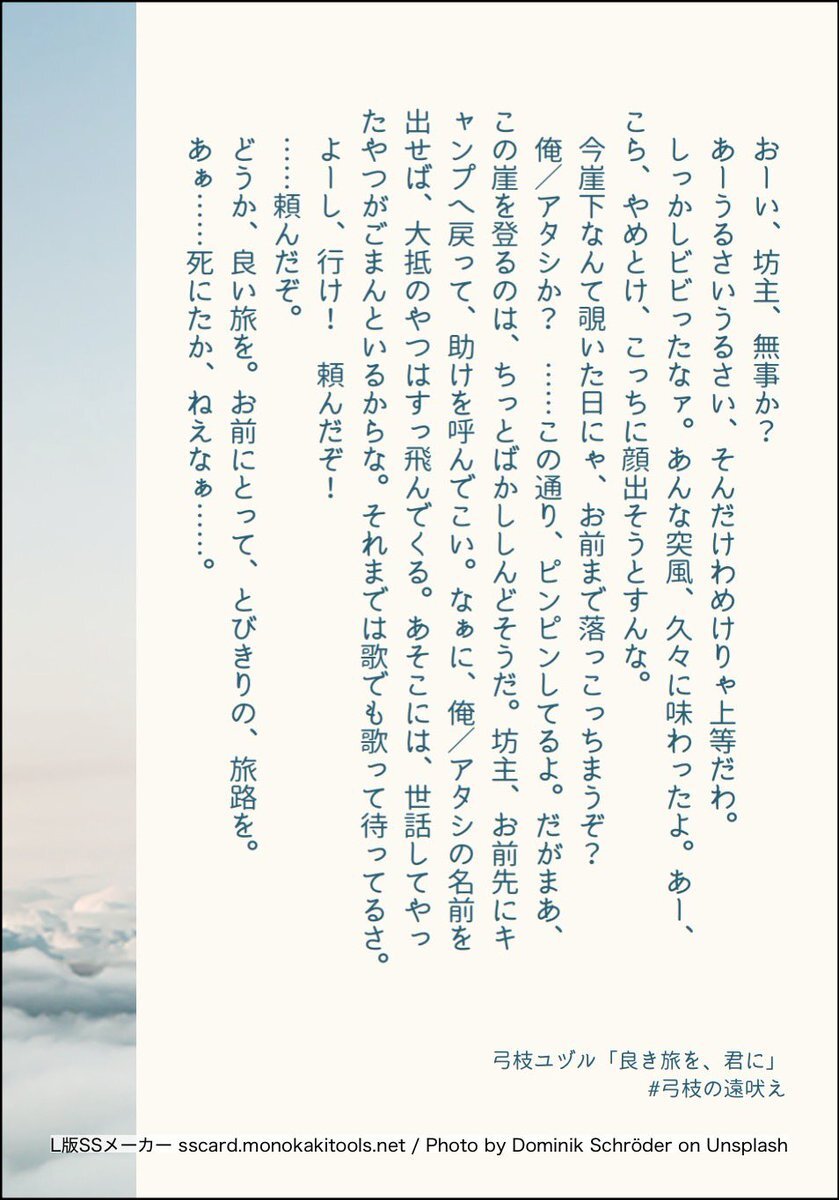 #フリー台本 #弓枝の遠吠え フリー台本「良き旅を、君に」です。