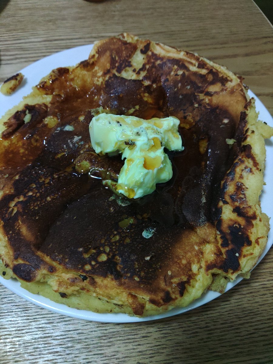 皆さんおはようございます(^^)/ #今日の朝ごはん🍚 はバカデカいパンケーキ🥞焼いてみた。 デカすぎて盛り付けに失敗してビミョーに形が崩れてワイルドな仕上がりに💧 #おうちごはん #漢めし #漢の料理 pic.x.com/ypsRqgvqNA