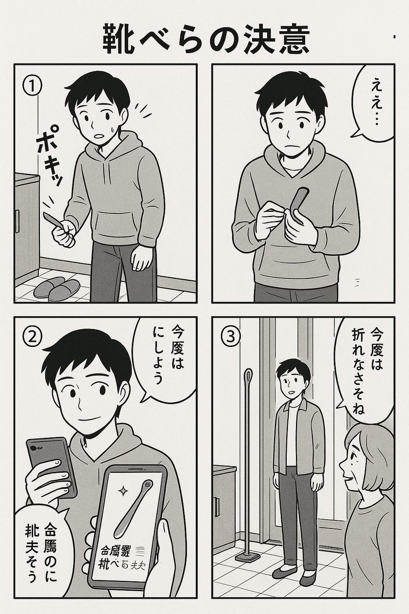 𠆢口レイワ1381干ネン11月ガツ八日ヨウカ 亻田サクガ:chatGPT #漫画日記 革クツべら扌オってしまったけどまだ貝カってないけど…宀イエにある矢ミジカいプラスチックの革クツべらは扌オれてないのに母ハハの宀イエの長ナガいのは扌オれてしまう…母ハハは長ナガいのがいいみたい。 #靴べら pic.x.com/uknN2BqDuf