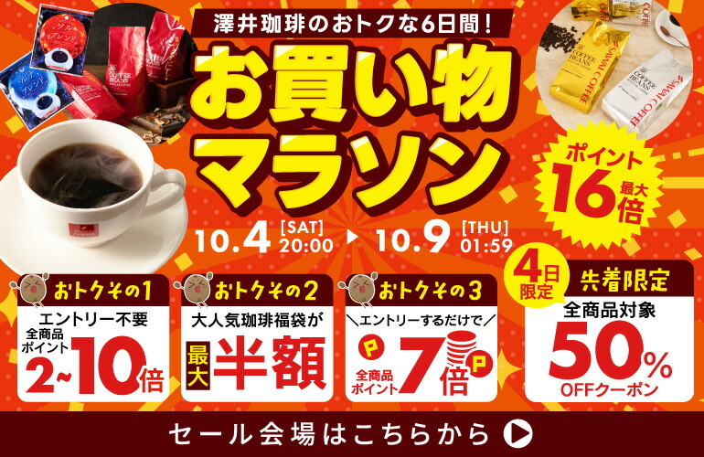 #楽天お買い物マラソン 【本日20時から】START☕まもなく開幕 ✅半額商品多数ご用意! ✅最大お値引き2,500円OFF #クーポン配布 ✅キーワードプレゼントもご用意♪ セール会場はこちら▶ rakuten.ne.jp/gold/sawaicoff… #澤井珈琲 #楽天市場 #コーヒー #珈琲 #セール情報 pic.x.com/h3NwwvHpLy