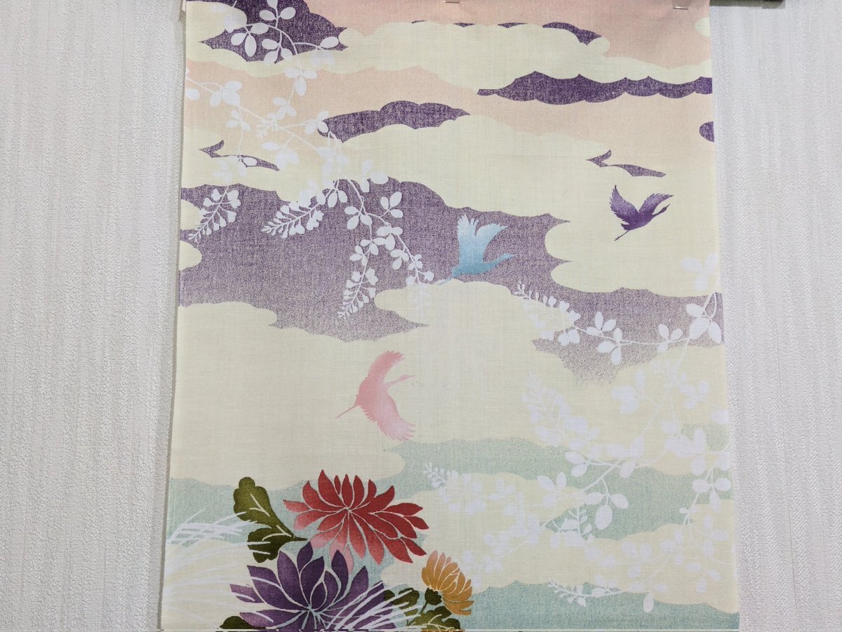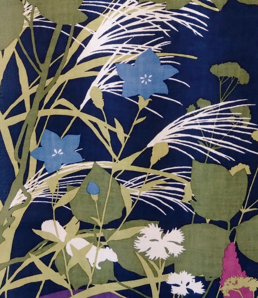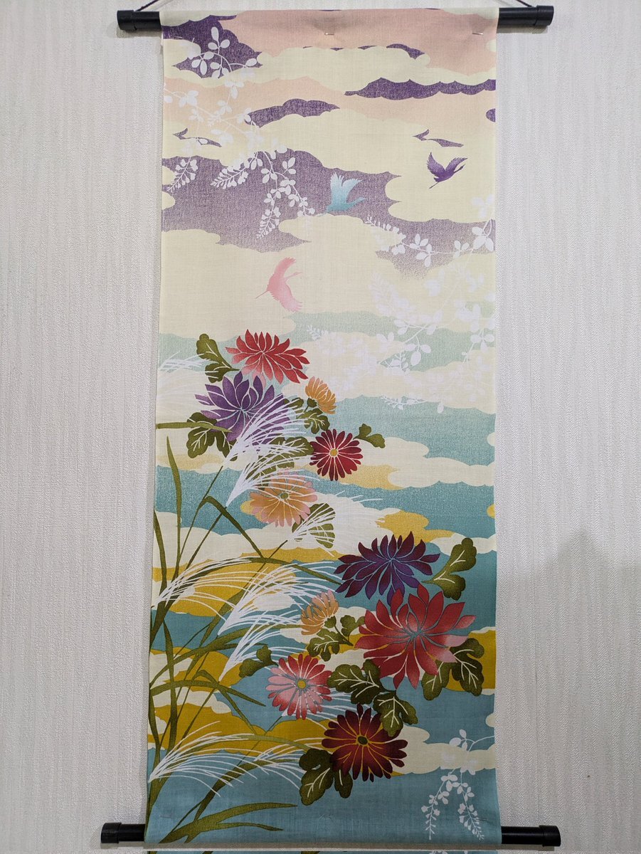 候が移りました 萩と薄の秋の七草と 大輪であでやかな菊の織りなす 「秋の夢」 空は幻想的なグラデーション 今日は霜降 初候 第五十ニ候 霜始降(しもはじめてふる)です #てぬぐい #濱文様 #霜降 #霜始降 pic.x.com/hBxcf2aym5