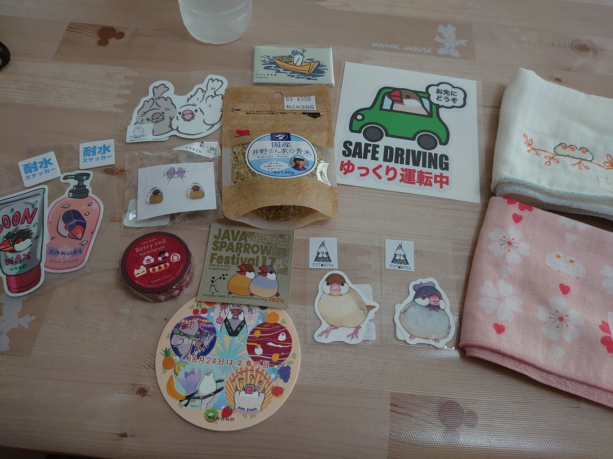 #文鳥まつり #横浜モアーズ 昨日(一昨日行けなかったので)の戦利品✌🐦 #濱文様 のガーゼハンカチの文鳥柄が増えていて迷わず購入⸜(*´ᗜ`*)⸝ たくさん買っちゃった〜! ピアスもめっちゃ可愛いし! 耐水シールも可愛い❤ コースターはモアーズで食事した時に頂きました🥰 pic.x.com/BzJMMNVP29