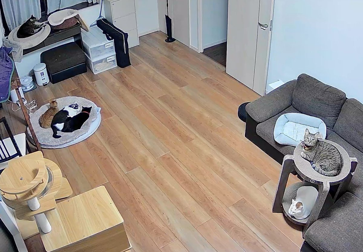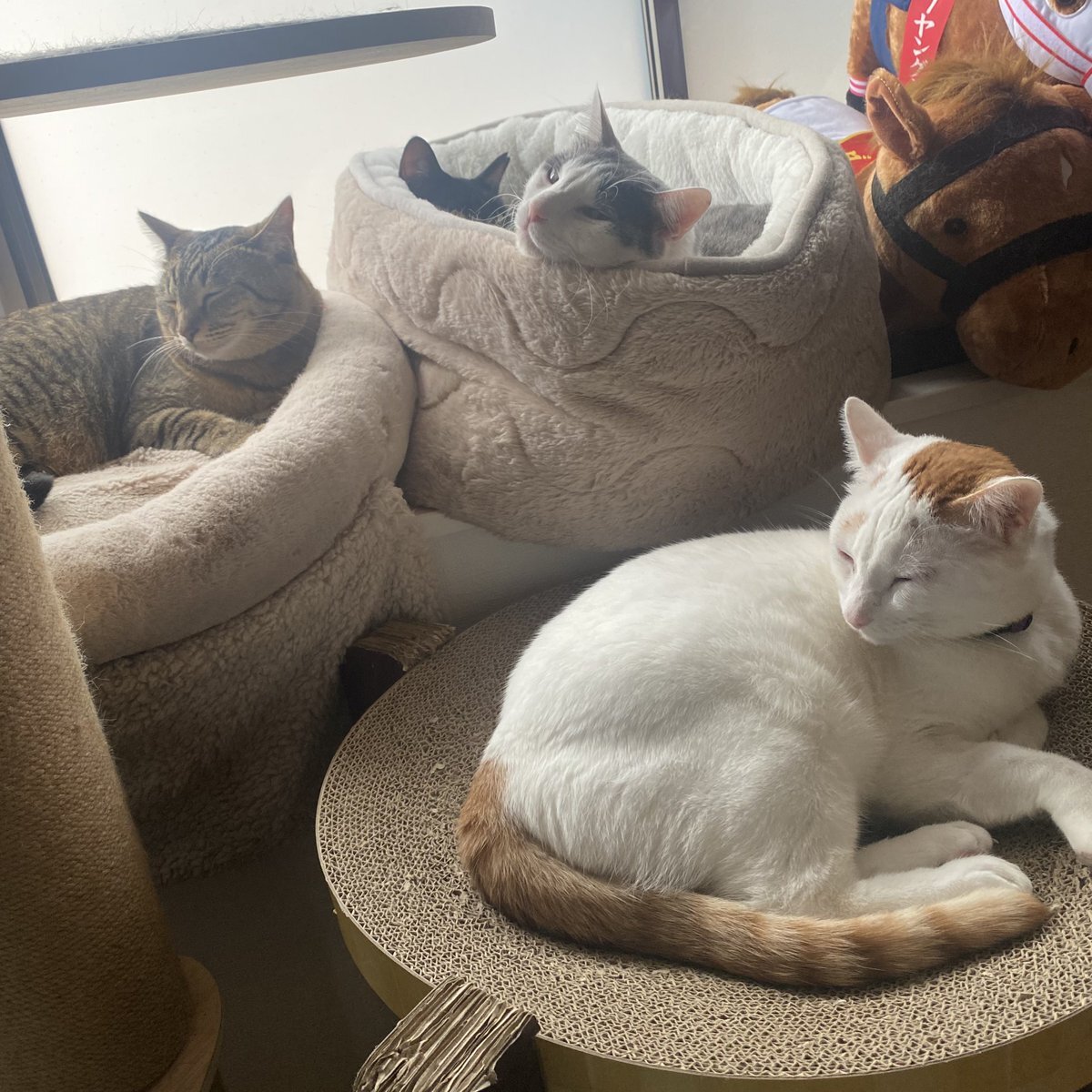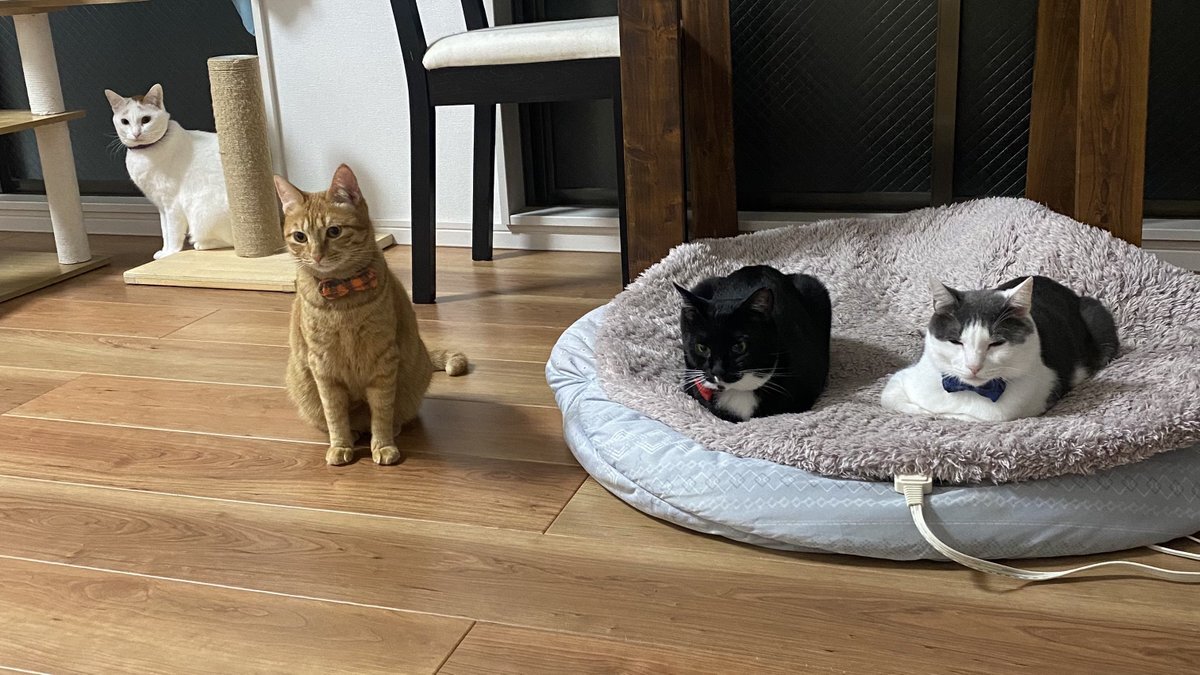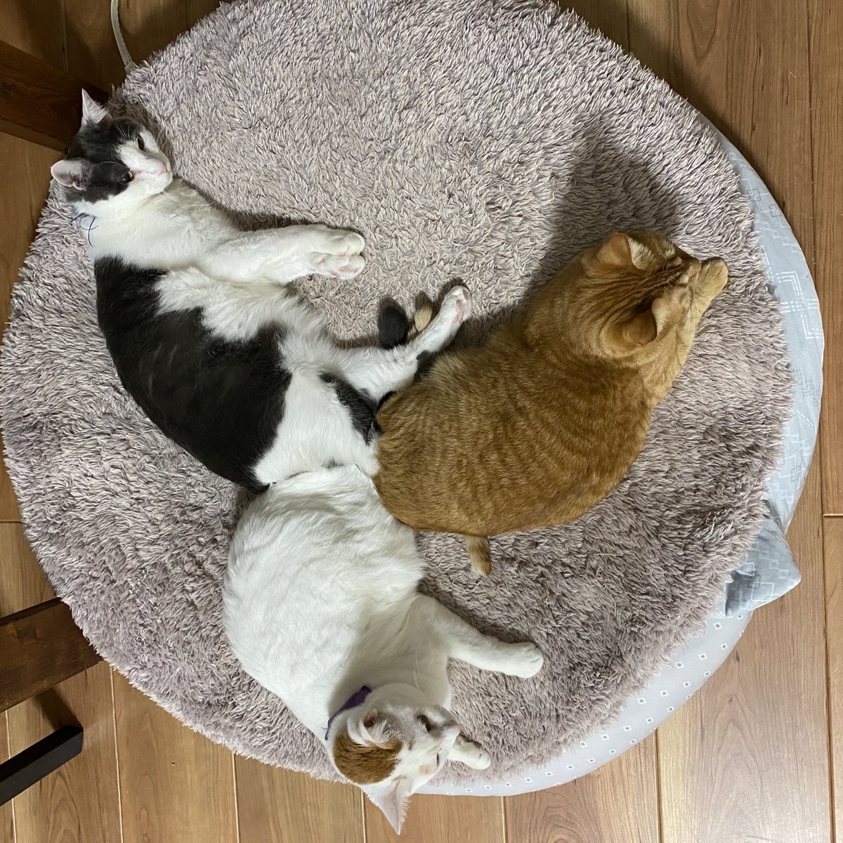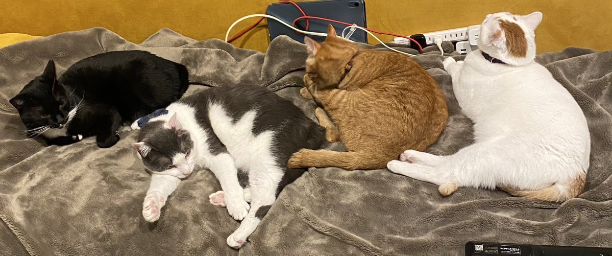 昨日の夜、さすがに寒いかなと思って猫部屋のホカペだけ付けたらさっそく夫人を両脇に携えてヌクヌクしてた #猫のいる暮らし #ねこかわいいね #キジトラ #灰白はちわれ #茶トラ #白茶 #黒白 pic.x.com/sE4rVNf12K