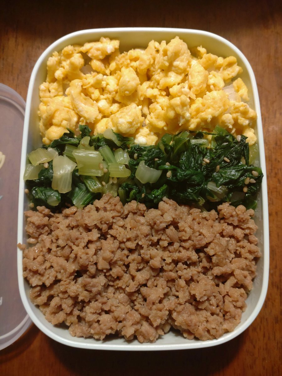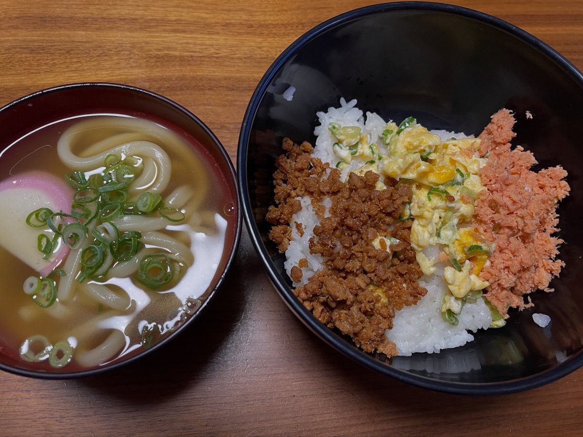 鶏そぼろ、鮭フレーク、炒り卵の3色丼と素うどん。お昼ご飯のメニューまで気が回らないので、手抜きが多い今日この頃orz #おとうさんの手料理 #おとうさんの昼ご飯 #家庭料理 #おうちごはん #三色丼 #鶏そぼろ #鮭フレーク #炒り卵 pic.x.com/bNfgZbTsml