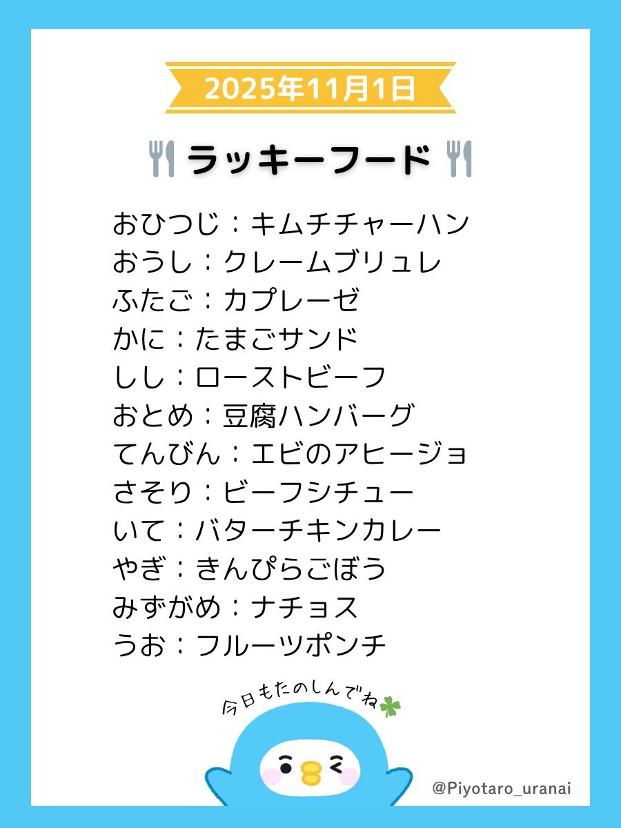おはようッピ🐥 今日の12星座別🌈ラッキーフードはこれ⇩ 今日もたのしんでね🍀 #今日の運勢 #点字記念日 #本の日 #紅茶の日 #すしの日 #犬の日 #カーペットの日 pic.x.com/91krVpqBDb