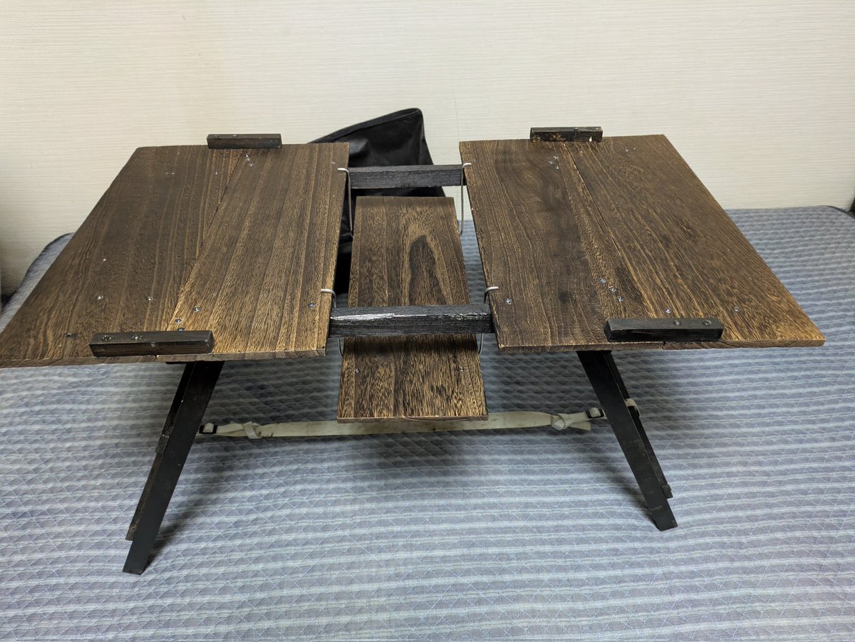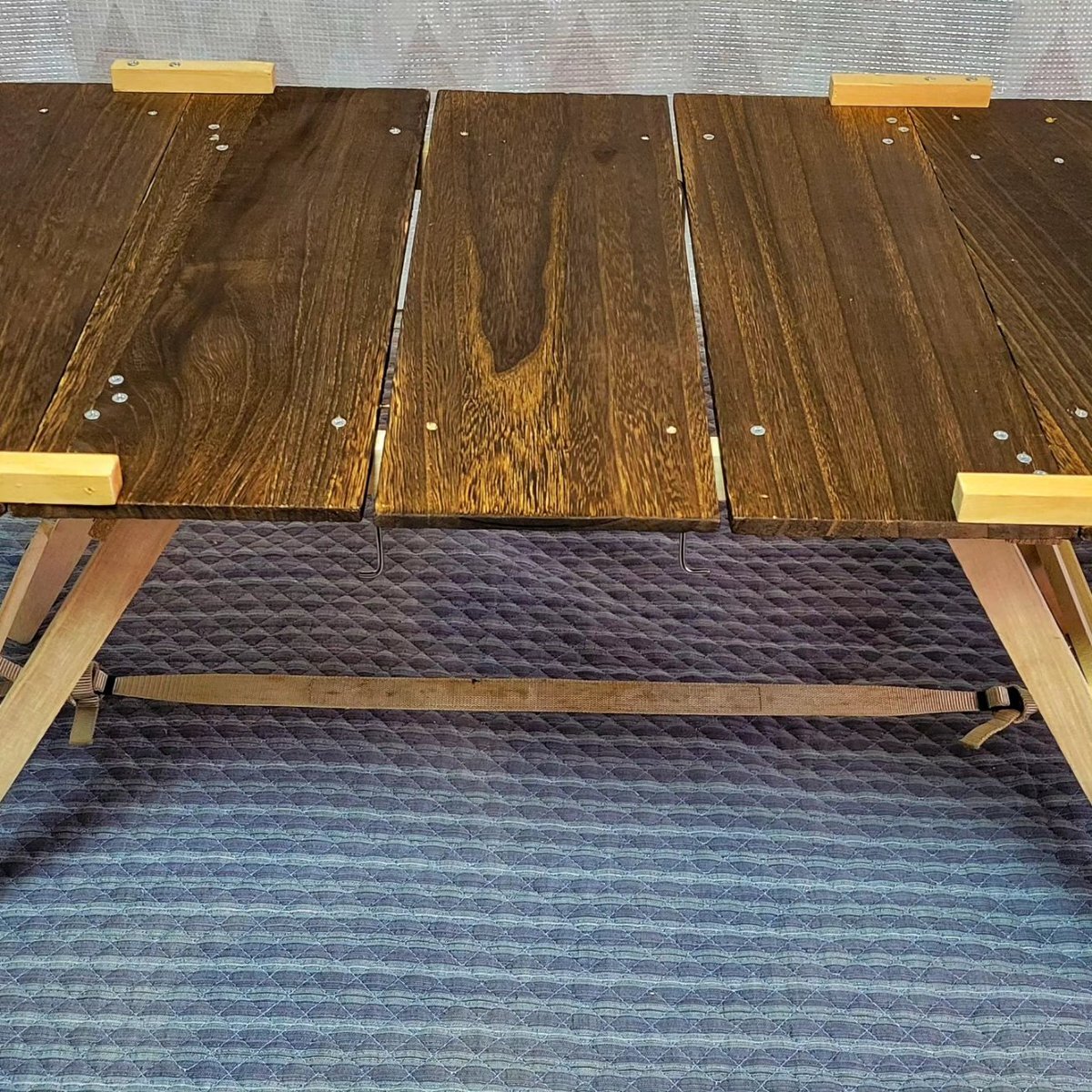 Seria材料で2024/5にDIYした折り畳みテーブル!!荷重テストで調子にのって20kg米袋乗せたら高さが41→38に下がり支柱グニャグニャに😭薪にするか迷ったけど昨悪天日に修理して復活😆 カーテンの隙間から明るい光!! 今夜は焚火出れるかも😁 #ソロキャンプ #焚火好きと繋がりたい #DIY #Seria #トリトン pic.x.com/O4vq9W6RoE