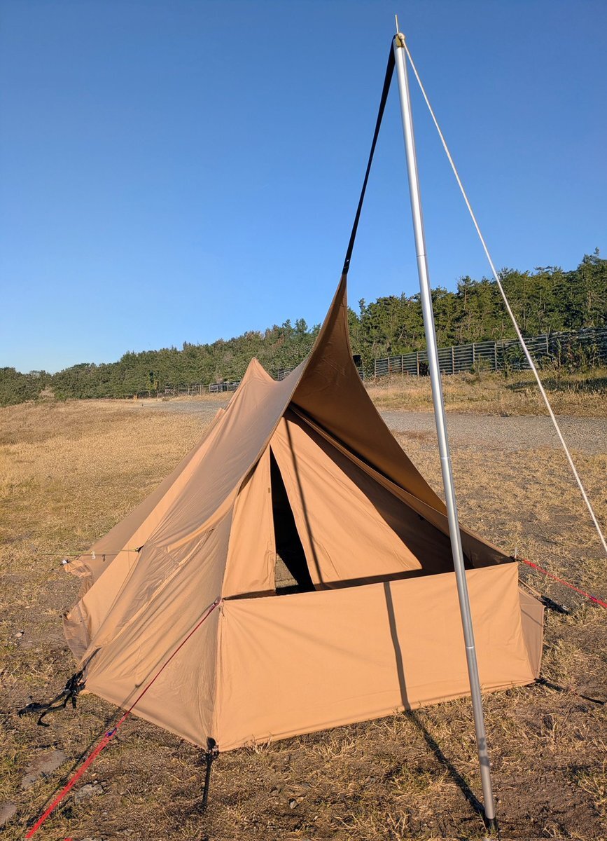 ワンポールテントのテンマクデザイン パンダ TCプラスに治具で二股化したらポールトップの5cm差し棒は抜きで伸縮ポールの長さは!? のお試しは205cmでした🙆‍♂️ 参考217cmは治具含めても入らなかった。 フロントヤードまで試し張り🤔 #ソロキャンプ #焚火好きと繋がりたい #パンダTCプラス #二股 #トリトン pic.x.com/3knEUmVTF1