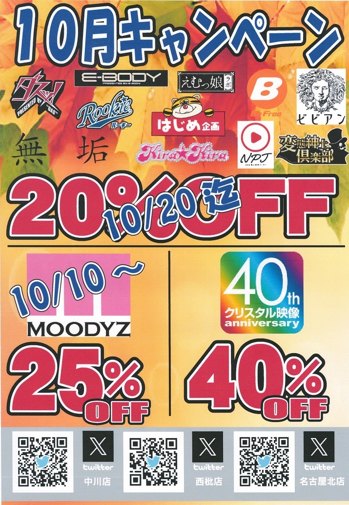 #秋のシコシコ強化月間 9/21~10/20の間、厳選11メーカーの 20%OFFセールを開催します 対象メーカー #ダスッ #イーボディ #無垢 #えむっ娘ラボ #変態紳士俱楽部 #ビビアン #はじめ企画 #ルーキー #キラキラ #ビーフリー #ナンパジャパン です。 皆様のご来店お待ちしております pic.x.com/dHRO4op76K