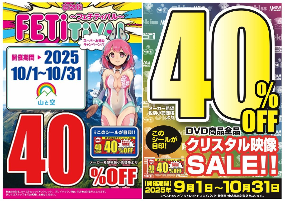 #DVD販売 #おとなのおもちゃ販売 10/15 本日水曜日は「得々セール」開催!! 今月は #FAプロ #アリスジャパン #ドグマ #クリスタル映像 #山と空 が40%OFF #ダスッ #イーボディ #無垢 等 #WILLグループ の11レーベルが30%OFF 皆様のご来店お待ちしております。 pic.x.com/VO5PrQxNZx