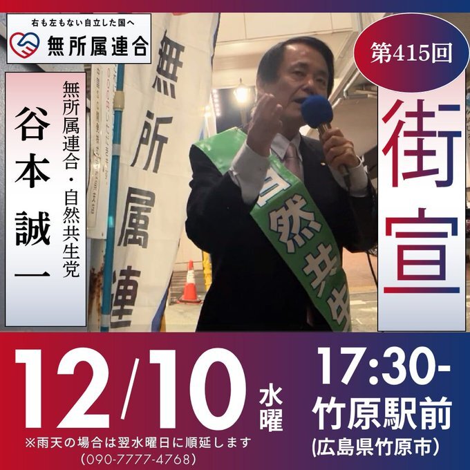 無所属連合 谷本誠一 街頭演説のお知らせです。 12/10(水)17:30- 竹原駅前 (広島県竹原市) ※雨天の場合は翌水曜日に順延します 無所属連合の理念や日本の現状など、直接現地でお聞きいただけましたら幸いです。 #谷本誠一 #無所属連合 pic.x.com/Du485NH7CH