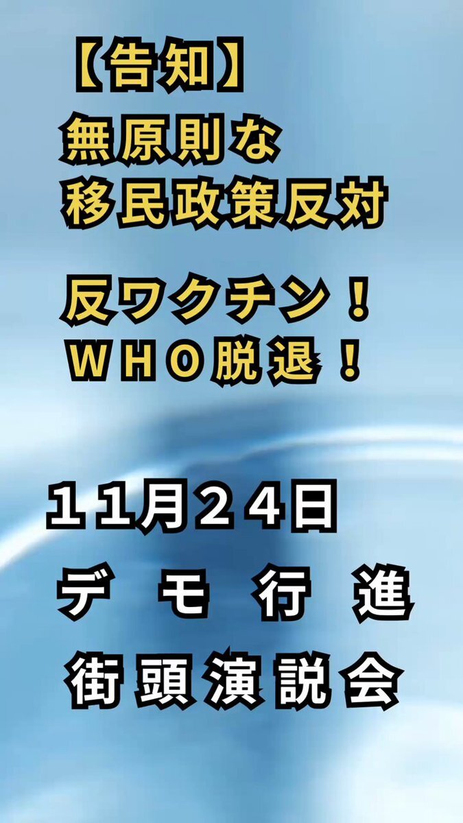 11月24日 無原則な移民政策反対、反ワクチン!WHO脱退! デモ行進&街頭演説会 集合 10:45 野崎公園 デモ行進 11:00出発 街頭演説会 12:00〜14:00 #新党くにもり #無所属連合