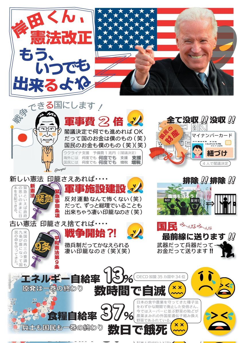 何度だって言う。憲法改悪されたら、抗議者は逮捕・拷問される。 今しか抗議の声は出せない! ⚠緊急事態条項=国民から抵抗出来なくさせる ⚠9条自衛隊明記=敵国条項に反する=原発・国内生産率37%・エネルギー自給率13%の日本は数時間で全滅 #憲法改悪は戦争への誘い #無法者に改憲発議の資格なし pic.x.com/nERTtPf7RA