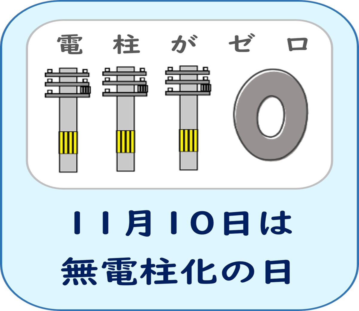 ● #無電柱化の日 景観や防災などの観点から電柱をなくす「無電柱化」を目指している「 #無電柱化民間プロジェクト 」が制定しました。 日付は11月10日を「1110」として、「1」を電柱に見立て、それが「0」(ゼロ)になることを願って定められました。