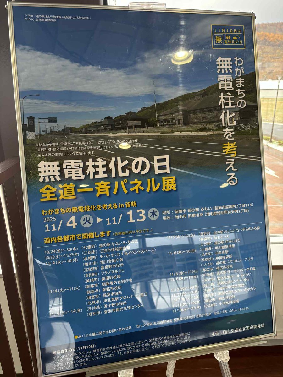 【#道の駅 なないろ・ななえでの展示】 11月10日は #無電柱化の日。現在、道の駅なないろ・ななえで開催中の #無電柱化パネル展(10/24~10/30)に行ってまいりました。明日で終わりですので、道の駅にお立ち寄りの際は、是非見てください👀 次回は、#函館市中央図書館(11/7~1🖼1/14)での開催🖼 x.com/mlit_hkd_hk/st…