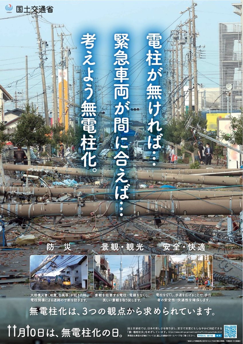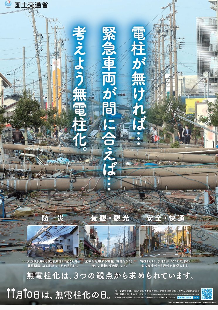 / 📢11月10日は、無電柱化の日 \ 電線類を地中化することにより、道路から電柱・電線を無くすことを「無電柱化」といいます 「防災」「景観・観光」「安全・快適」3つの観点から、無電柱化が求められています #東北地方整備局 #無電柱化の日 pic.x.com/CwI5VNxch8