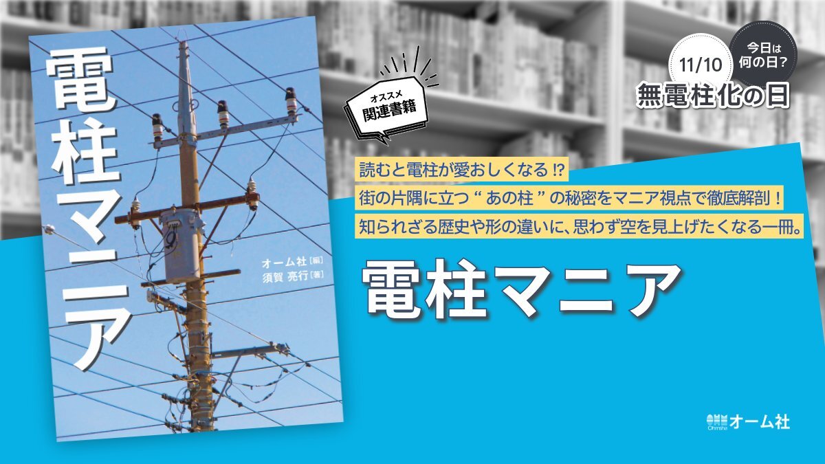 \ 11月10日 #今日は何の日 / ⇒ #無電柱化の日 数字の「1」を電柱に見立て、それを「0」にするという意味で11月10日と定められました。 関連書籍📘はこちら! 『電柱マニア』 無電柱化の日生まれの著者(おめでとうございます!)が、電柱の魅力をマニアックに紹介します。 ohmsha.co.jp/book/978427422… pic.x.com/tXLNjn4O3A