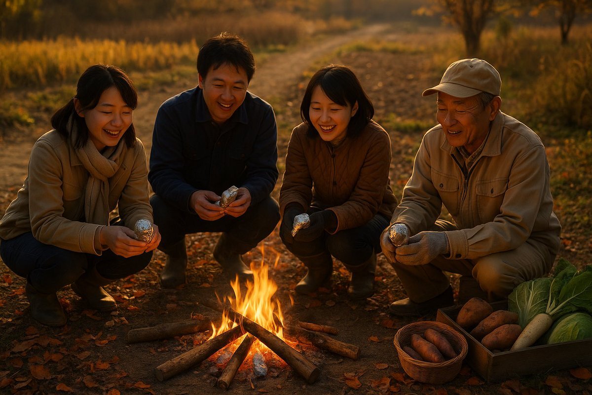 【焚き火のそばで】 夕方の畑に集まって、みんなで焚き火。 甘い香りの焼き芋🍠をほおばりながら、笑い声がひびく🔥✨ 寒い空気の中でも、心はぽかぽかや😊🍃 #焚き火のそばで #焼き芋の季節 #農家さんありがとう pic.x.com/RBhDbDN8uk