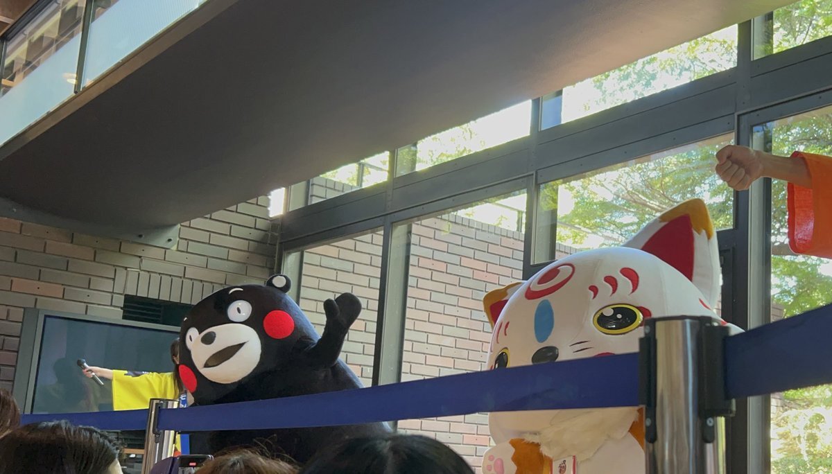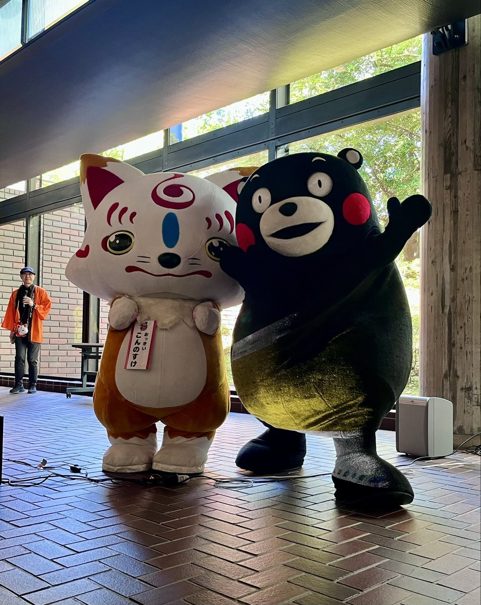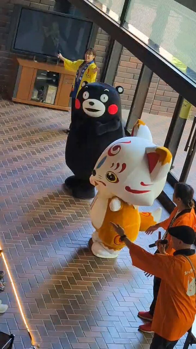 くまモンから確定ファンサ頂きました!!!キレキレのくまモンと短い手足で一生懸命踊ってるこんのすけがちょー可愛かったです❤❤ #松井文庫展 #おっきいこんのすけ #くまモン #熊本県立美術館 pic.x.com/ZctCE27EyV