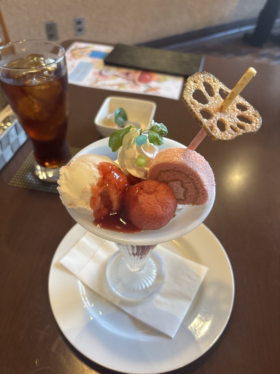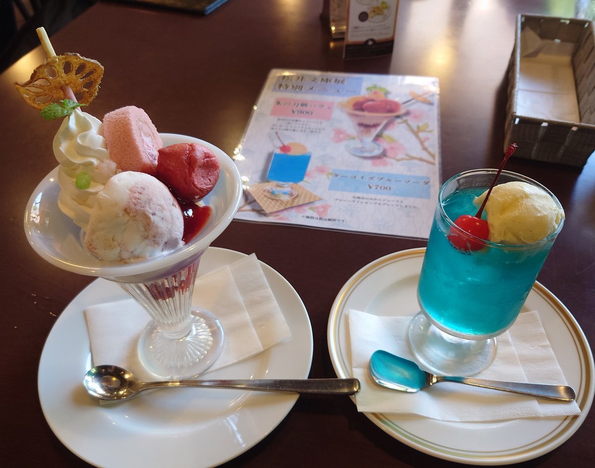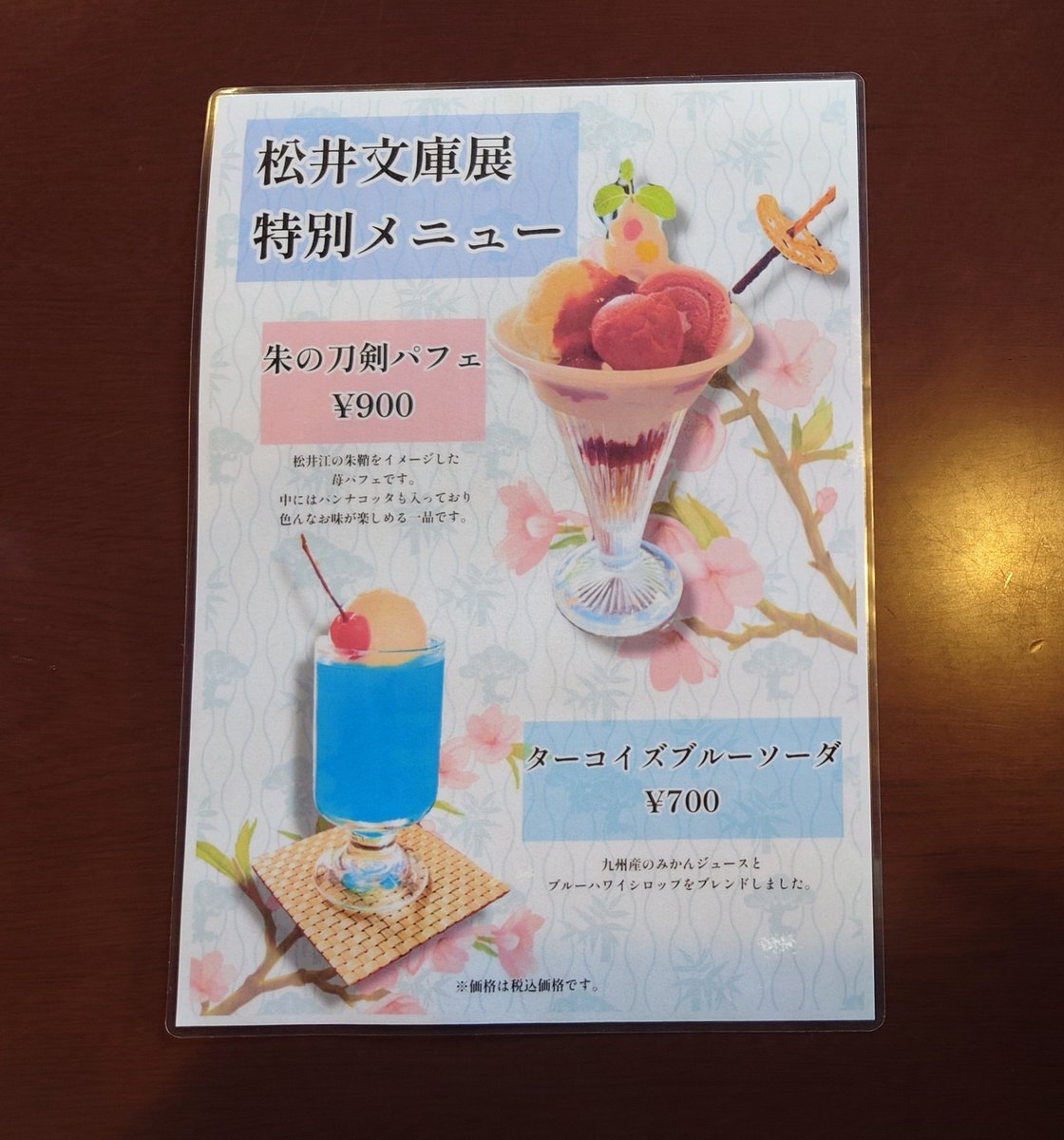 松井文庫展 特別メニュー 朱の刀剣パフェと ターコイズブルーソーダ 刀の鍔は辛子蓮根チップスでした✨️ ターコイズブルーソーダの バニラアイスがすごく美味しくて ソーダと相性抜群でした⿻*. #松井文庫展 #熊本県立美術館×#刀剣乱舞ONLINE pic.x.com/ym8GEtS0iH x.com/sakurasora0704…