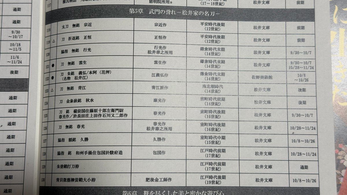 3代将軍より拝領の陣羽織(生地が高級そう)某ゲームで有名になった「松井江」とその拵えは別々の所が所蔵しているのでそろって見れるのは嬉しいです。黒い鞘も青い貝細工がちりばめられていて綺麗。ちなみに写真撮影不可だったので、画像はステッカーやら絵葉書やらです。#熊本県立美術館 pic.x.com/QEiYPLMdLX