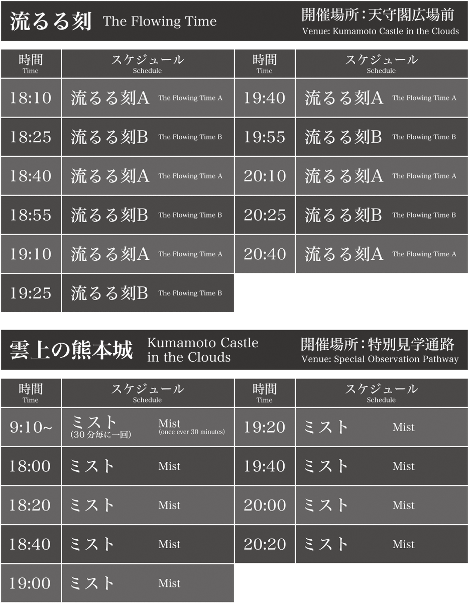 【秋のくまもとお城まつりタイムスケジュール⏱】 夜火夜火 流るる燈・雲上の熊本城のタイムスケジュールを公開します☝️ お越しの際はこちらをご確認ください~!!