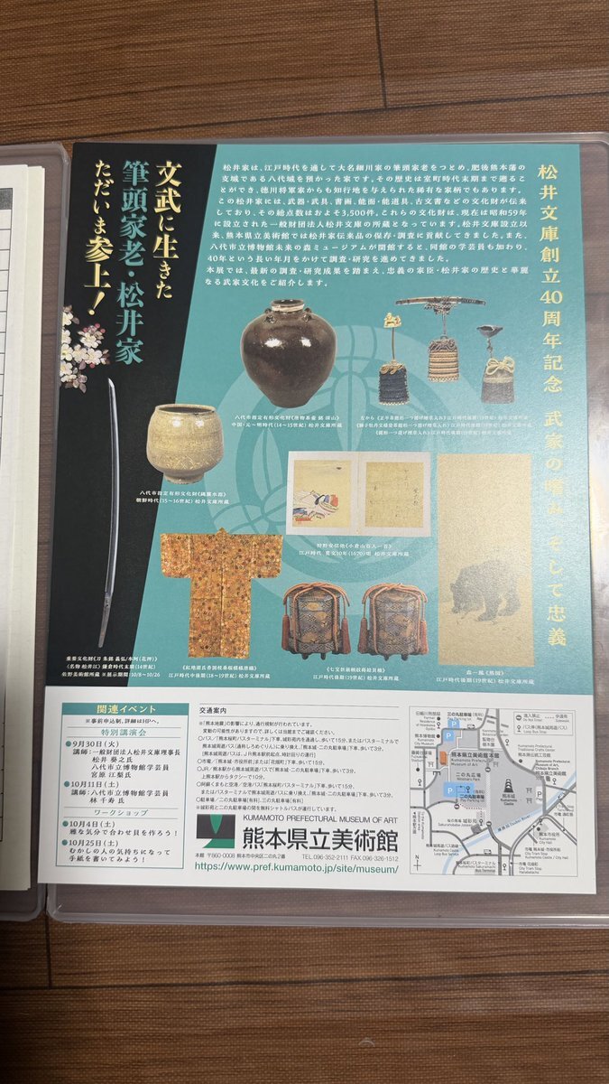 島原の海を越え #熊本県立美術館 に行ってきました。 #文武に生きた筆頭家老・松井家ただいま参上! と言うタイル 待ってましたと言いたくなる。 松井家に代々伝わる大名家のお道具類。八代市にある朱鞘の拵えと佐野美術館さんからは松井江の刀身。こうして一緒並べての展示はたいへん嬉しい☺️ pic.x.com/yQOiuikal4