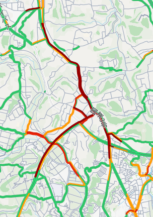昨日、今朝に引き続き、#熊本西環状道路 下硯川ICに出口渋滞。和泉IC~国道3号北部消防入口まで15分くらいかかっていそう。国道3号も両方向酷い。(図はTomTom Traffic 18:00) 今朝、下硯川ICの現地でを県警の方?が信号の観察をしていた。夕方は北BPよりも西環状を優先すれば少しマシになるか。