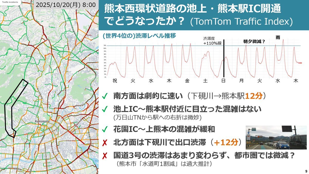 先週の講演@くまもと21の会 では #熊本西環状道路 のスライドを追加。speakerdeck.com/trafficbrain/2… その後もTomTomをウォッチしてますが、開通前週に比べると、市全体の朝ピークの渋滞レベルが10ptくらい減っていて、面的な効果が少し出ているようです。また車が増えないうちに快速バスなど公共交通政策を pic.x.com/0H0QvJnAQ5
