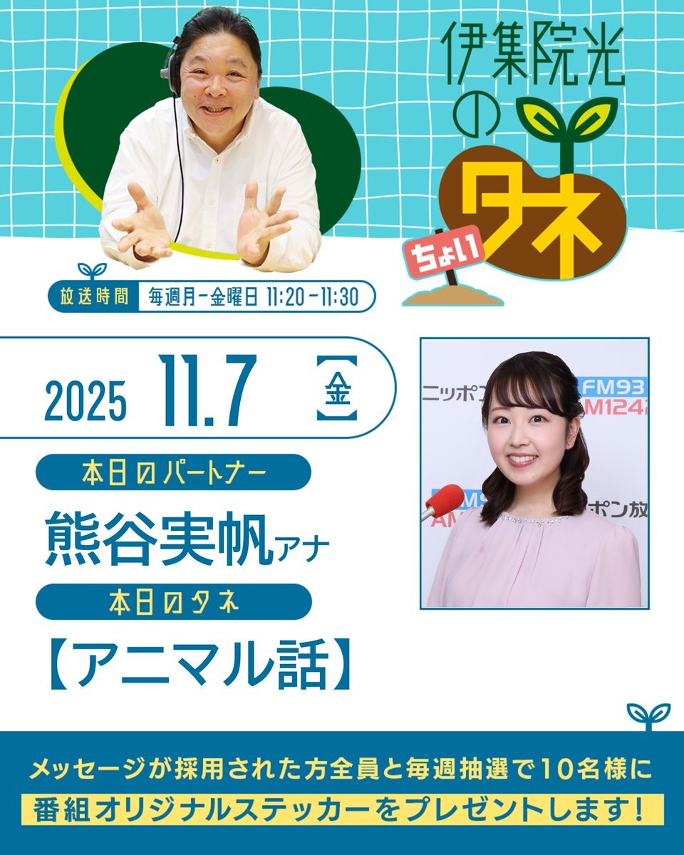 「伊集院光のちょいタネ」第407回 11時20分スタート👐 🌱パートナーは、熊谷実帆アナウンサー 🌱本日のタネは「アニマル話」 🔽本日のradikoはこちら! radiko.jp/share/?t=20251… 📍各タネへの投稿はいつでも受付中! ssl.1242.com/aplform/form/a… #伊集院光のタネ