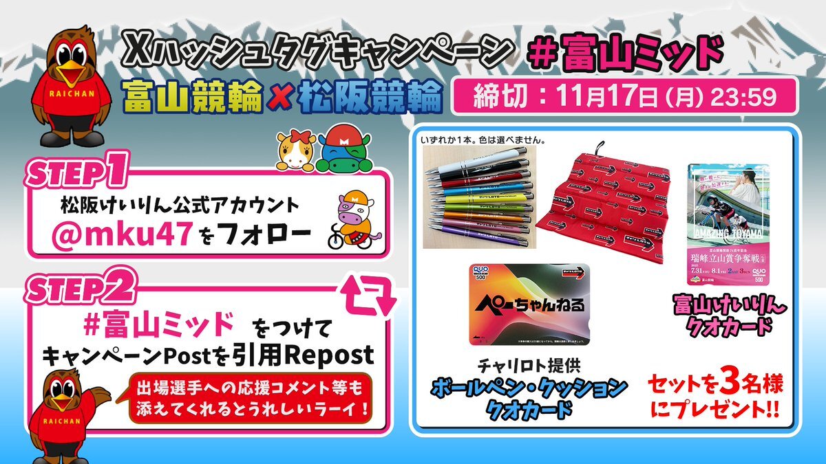 Repost #キャンペーン 富山FIIミッドナイト♥in松阪 「チャリロトぺーちゃんねる杯」 開催を記念して オリジナルグッズを 3名様にプレゼント🎁 応募は ①@mku47 をフォロー ②本投稿に #富山ミッド をつけて引用Repostで応募完了! 応募は11月17日㊊23時59分まで! #松阪けいりん #富山けいりん