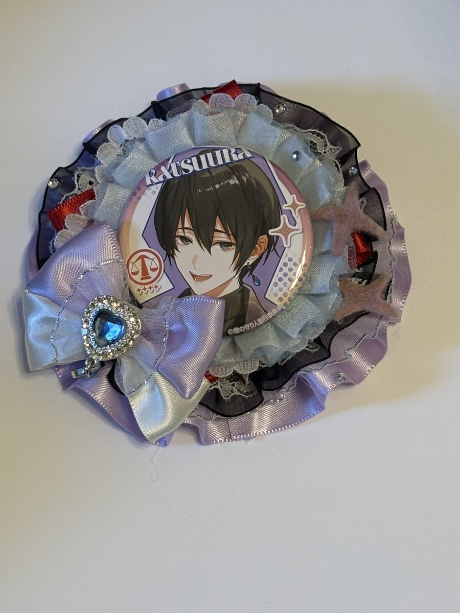 逆光4章 勝浦 ロゼット 缶バの背景の色が紫なので紫を多く入れて! 勝浦の赤と黒を少し入れて 缶バにある✨️をロゼットにもつけて 暗くはせず明るめにでも勝浦要素も少し入れて可愛くできましたー!! #燈の守り人 #勝浦灯台 #あかりび pic.x.com/CeTqOpyABF