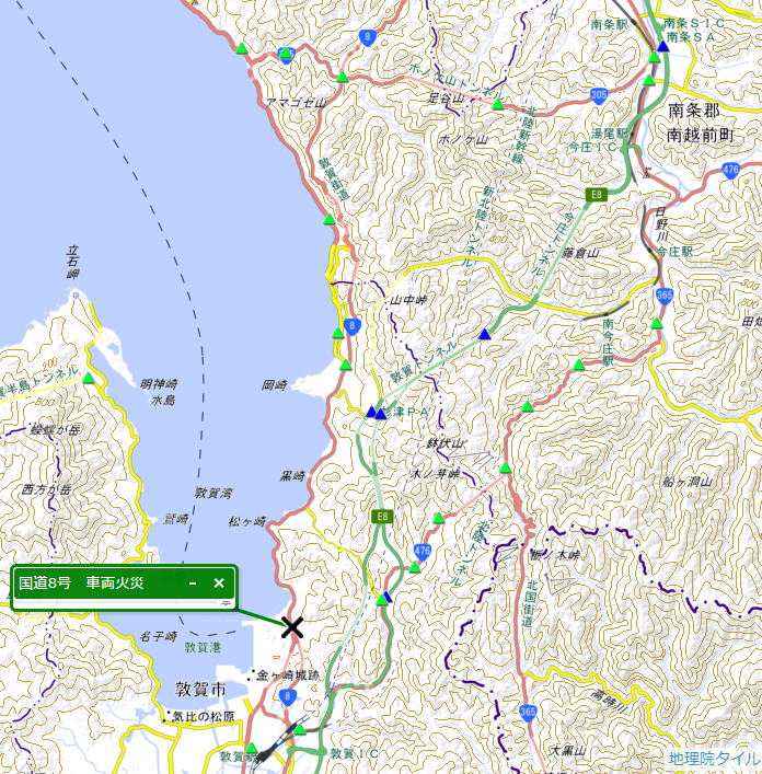 11/1【#国道8号 #車両火災】国道8号は敦賀市赤崎で車両火災のため、国道8号 上下線の敦賀市田結と南越前町桜橋交差点の間が11/1 10:40~通行止になっています。国道305号~365号~国道476号などへ迂回してください。