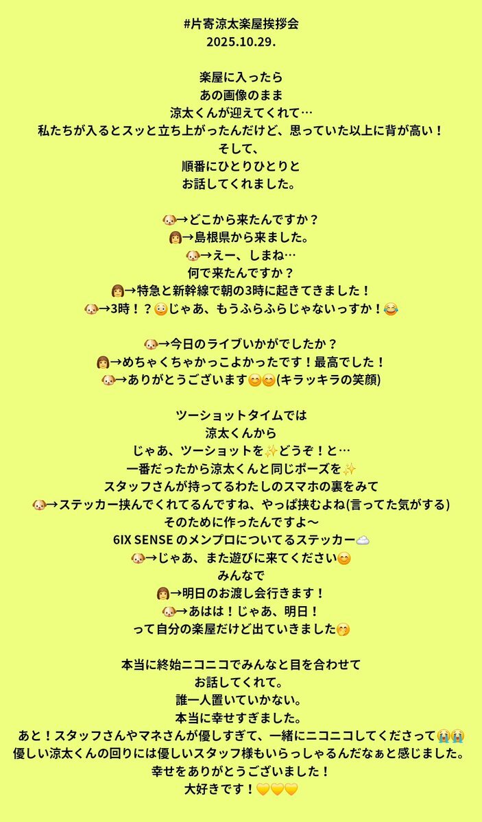 2025.10.29 なんと 涼太くんの楽屋挨拶会にお呼ばれ(?)してきました💦 楽屋に行かせて頂いて涼太くんずぅぅーと優しくてひとりひとりと会話してくれて幸せすぎます😭 お写真も大事にします。 スタッフ様も優しすぎました😭😭 本当に本当にありがとうございました😭 #片寄涼太楽屋挨拶会 #ヨセの楽屋 pic.x.com/Pwz7mlT9nj