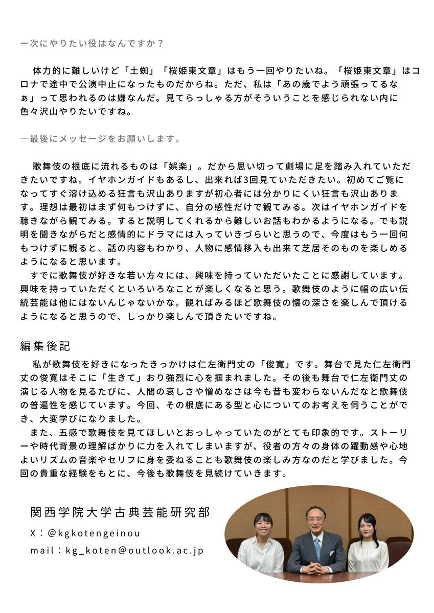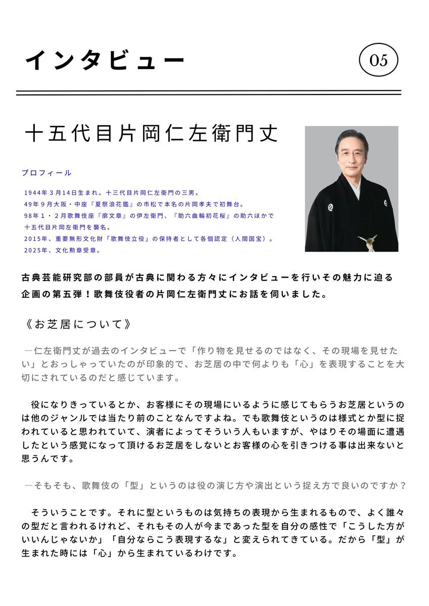 古典芸能研究部のインタビュー企画第五弾! 今回は歌舞伎役者の片岡仁左衛門丈にお話を伺いました。 私どもの質問に丁寧に答えていただき、本当にありがとうございます。 歌舞伎の型や魅力についての貴重なお話が満載です。 皆様、ぜひご一読ください! #片岡仁左衛門 丈 #歌舞伎町 pic.x.com/o5utGNuh15