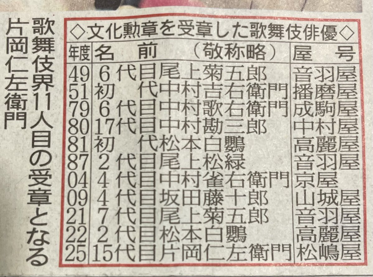 片岡仁左衛門さん、文化勲章おめでとうございます。歌舞伎俳優では22年の松本白鸚さん以来、3年ぶり11人目です。 日本芸術院会員、人間国宝、文化功労者、文化勲章の4つを獲得している現役の歌舞伎俳優は7代目尾上菊五郎さんと仁左衛門さんの2人になりました。 #片岡仁左衛門 #歌舞伎 pic.x.com/MVrsYABJLC