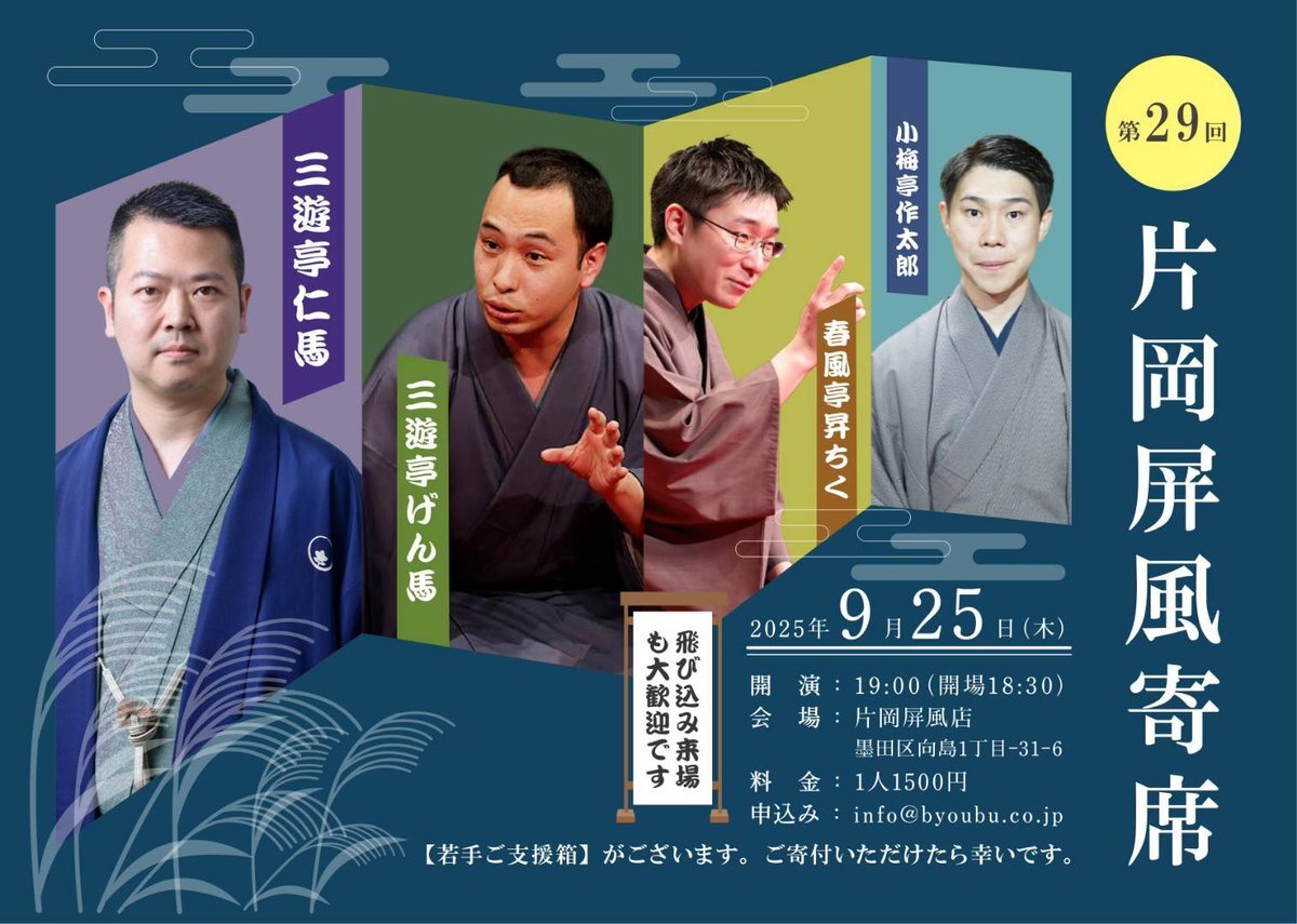 【 #片岡屏風寄席 】 \ #寄席 は明日‼️ / 日時:2025年9月25日 開演:19時 開場:18時30分 TEL:03-3622-4470 本ツイートや公式HPのお問い合わせでもご予約受け付けております🙇🏻♂️ #片岡屏風店 #屏風 #落語 #イベント #event x.com/kataoka_byoubu…